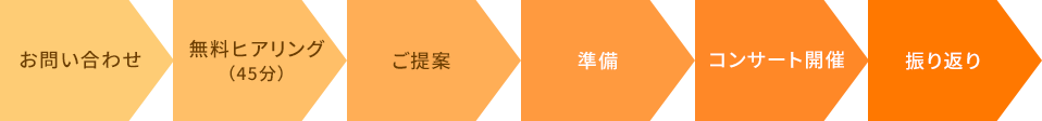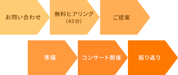初回のみヒアリングは無料で承っています。ご提案後、ご納得いただいてからスタートとなります。準備、コンサート開催、終了後のフィードバックまで伴走いたします。